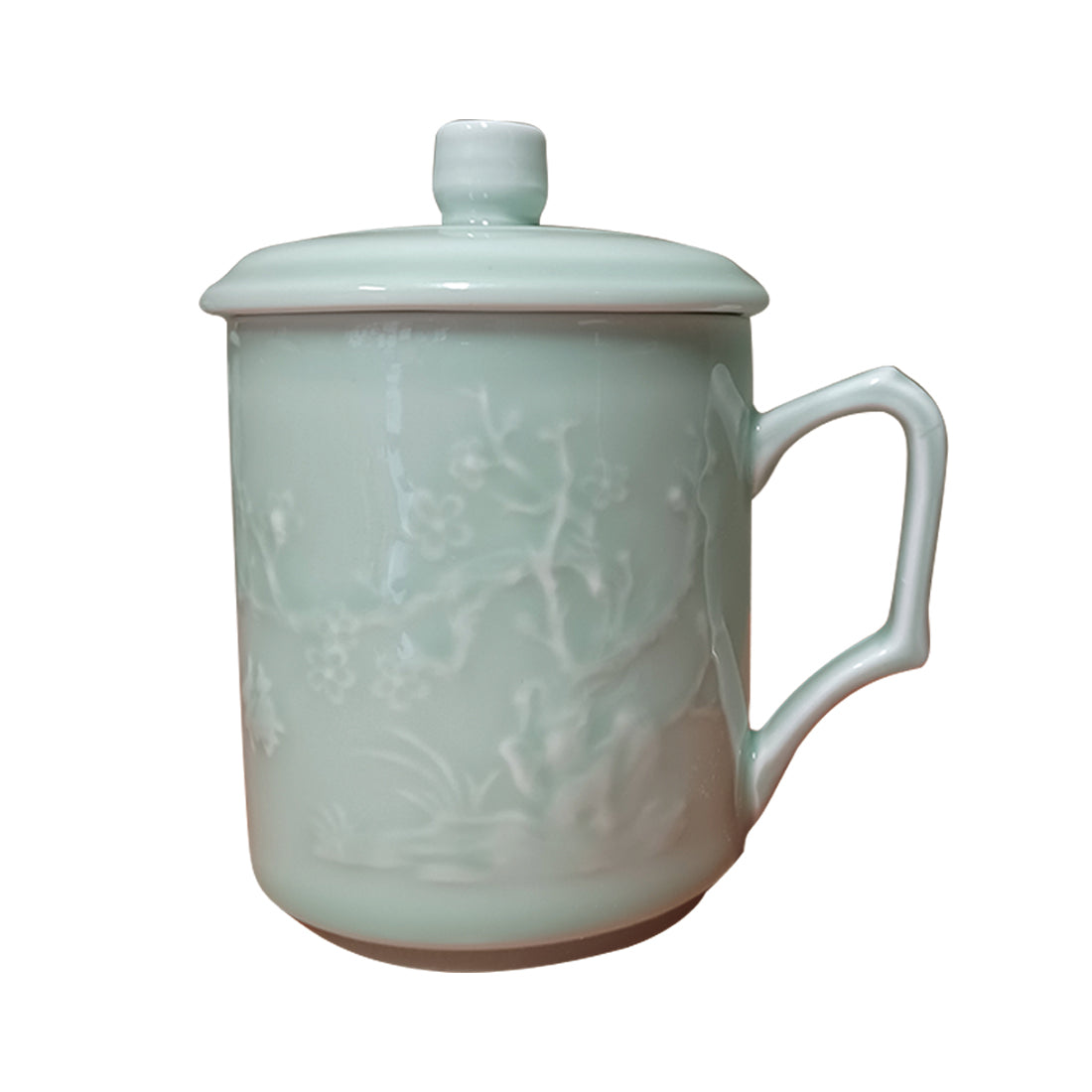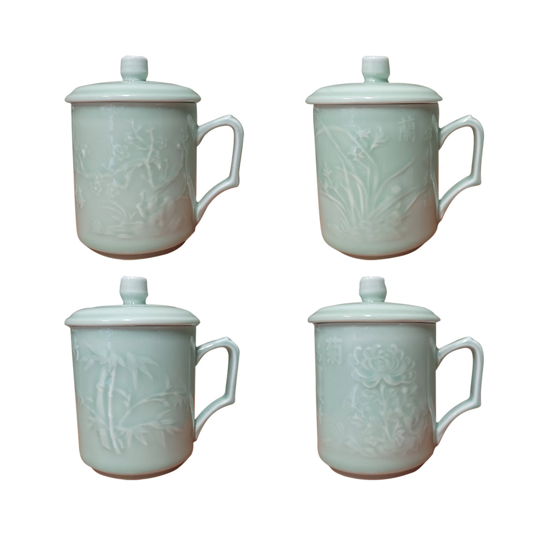 Celadon is a French word that describes the soft sea-green glaze that became popular in China's Song Dynasty (960-1279). Celadon is one of the most popular ceramic styles for classic teaware. Each Celadon mug is accompanied by a matching lid and features a distinctive handle. The floral artwork on each mug depicts one of the 4 seasons.