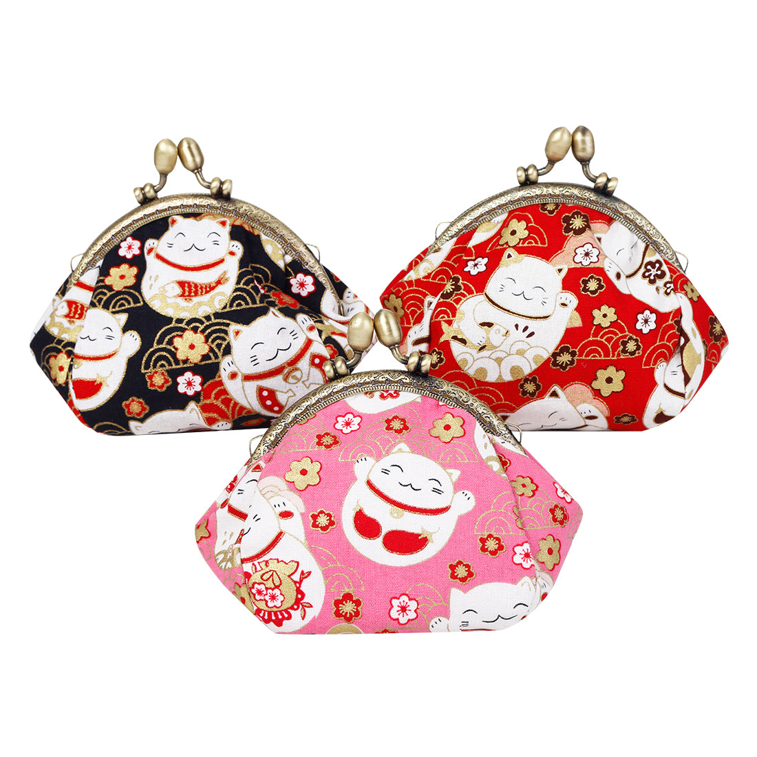 The image showcases a set of three charming coin purses, each adorned with a playful Maneki-neko (beckoning cat) design. These purses come in three vibrant colors: black, red, and pink, each featuring traditional Japanese motifs and floral patterns that add to their aesthetic appeal. The metal kiss-lock clasp at the top adds a touch of vintage elegance, ensuring the contents are secure. These coin purses are not only practical for carrying small items but also serve as delightful accessories that bring a touch of cultural flair and good fortune to the user. Perfect for gift-giving or personal use, they combine functionality with a touch of whimsical charm.